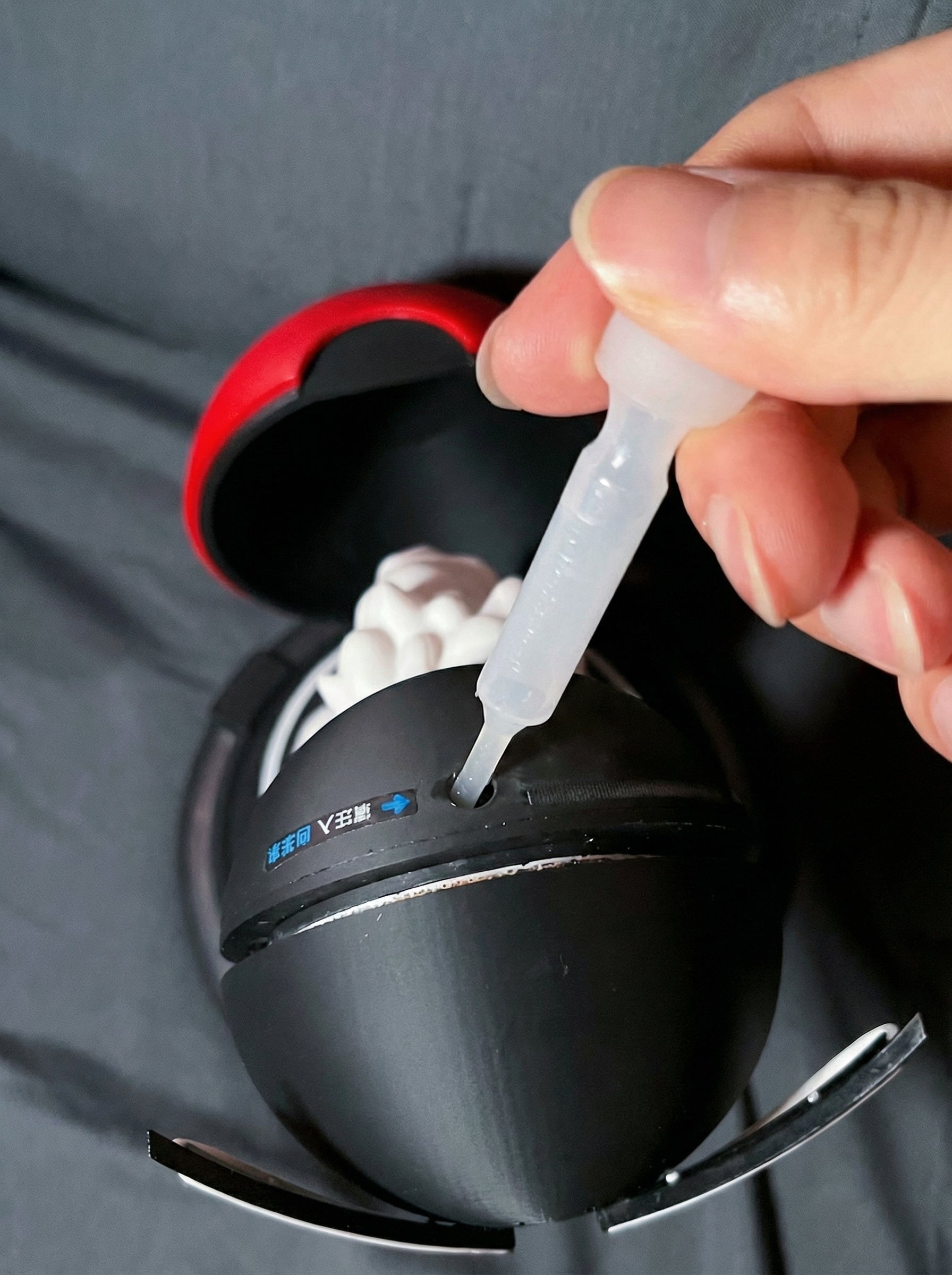 Usa el gotero incluido parallenar el depósito directamenteen la base de la figura. No necesitas líquidos especiales — agua regular funciona perfectamente. Llena hasta la línea indicada y vuelve a cerrar.